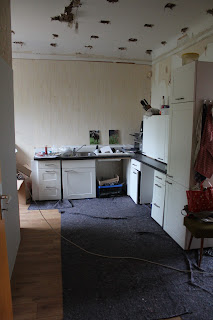 es wurden die abgehängten holzdecken entfernt, in 5 räumen. in zwei räumen wurde die decke mit rigips neu verkleidet, in einem anderen raum kann die originalhöhe erhalten werden, dort wird "nur" gespachtelt. die tapete ist ab und jede unebenheit glatt gespachtelt. die alten holzdielen sind raus. die schlacke darunter entfernt und die alten balken mussten auch weg, da sie morsch waren. zwischen wohnraum und küche wurde die wand (ehemalige außenmauer) entfernt. das bad wurde ebenfalls erweitert, also wand raus und zwei neue gesetzt.